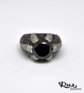 Modelo: Sortija Diamantes. Descripción: Sortija de oro blanco de 18 quilates con diamantes blancos y negros, con un solitario de diamante negro centra. Peso total 23,09. Precio: €13,900.00