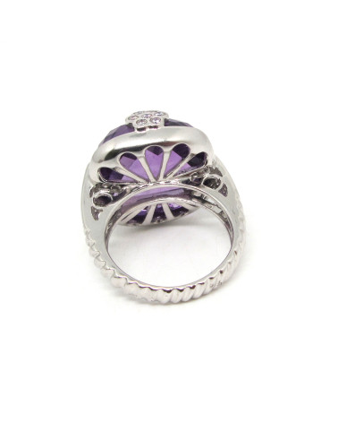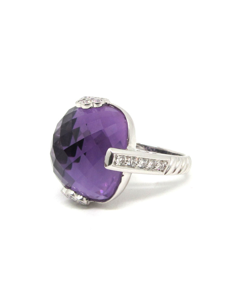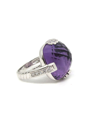 - Sortija de oro blanco con una amatista facetada con brillantes.