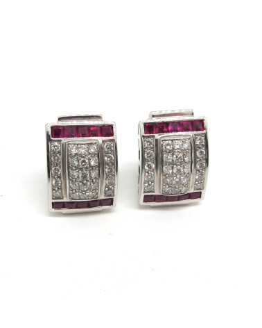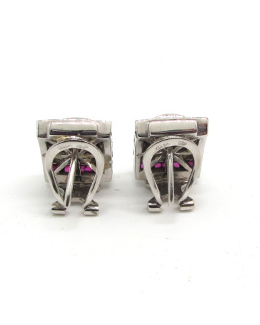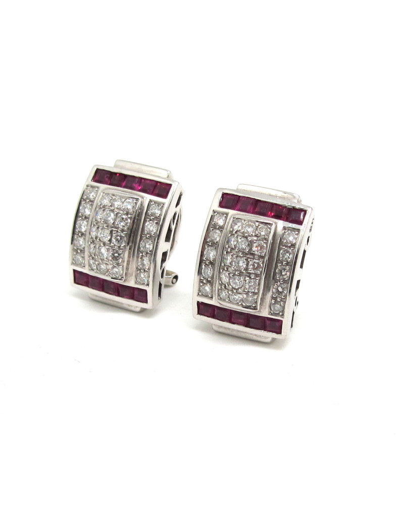 - Pendientes de oro blanco con rubies y brillantes, cuadrados con cierre omega.